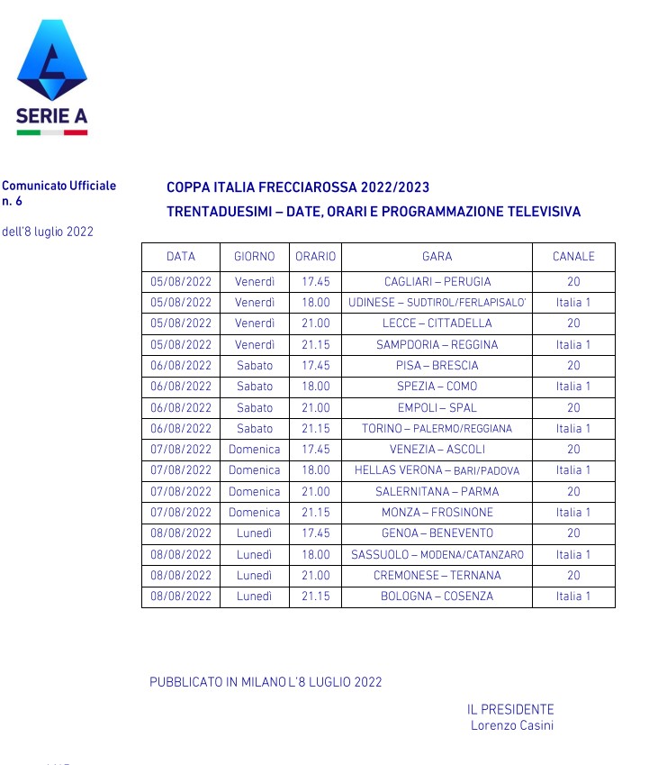 Sono ufficiali i primi appuntamenti della Coppa Italia Frecciarossa 2022-23, al via il prossimo 30 luglio con Sudtirol-Feralpisalò per la prima gara del turno preliminare.